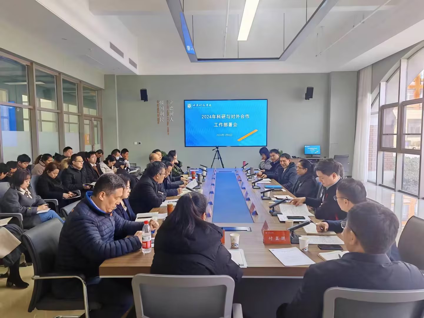为进一步明确学校2024年关于科研与对外合作工作的目标方向与重点任务,3月8日上午,我校在立业楼M107会议室召开了2024年科研与对外合作工作部署会。副校长杨新新,校长办公室副主任付显随,副处长王利朋、朱伟、周观兵,各教学单位院长、科研副院长/院长助理、科研秘书