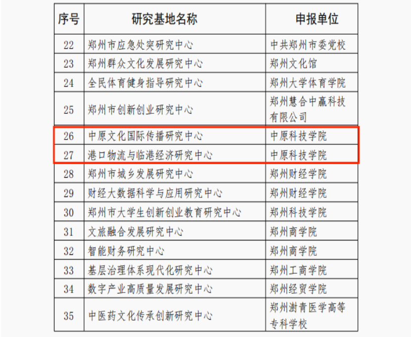 根据郑州市社科联《关于公布第二批郑州市哲学社会科学研究基地和第一批郑州市哲学社会科学重点研究基地的通知》(郑社字〔2022〕25 号),我校申报的“中原文化国际传播研究中心”和“港口物流与临港经济研究中心”经专家评审、社科联审核、公示等环节,被评选为郑州市哲学社会科学研究基地。